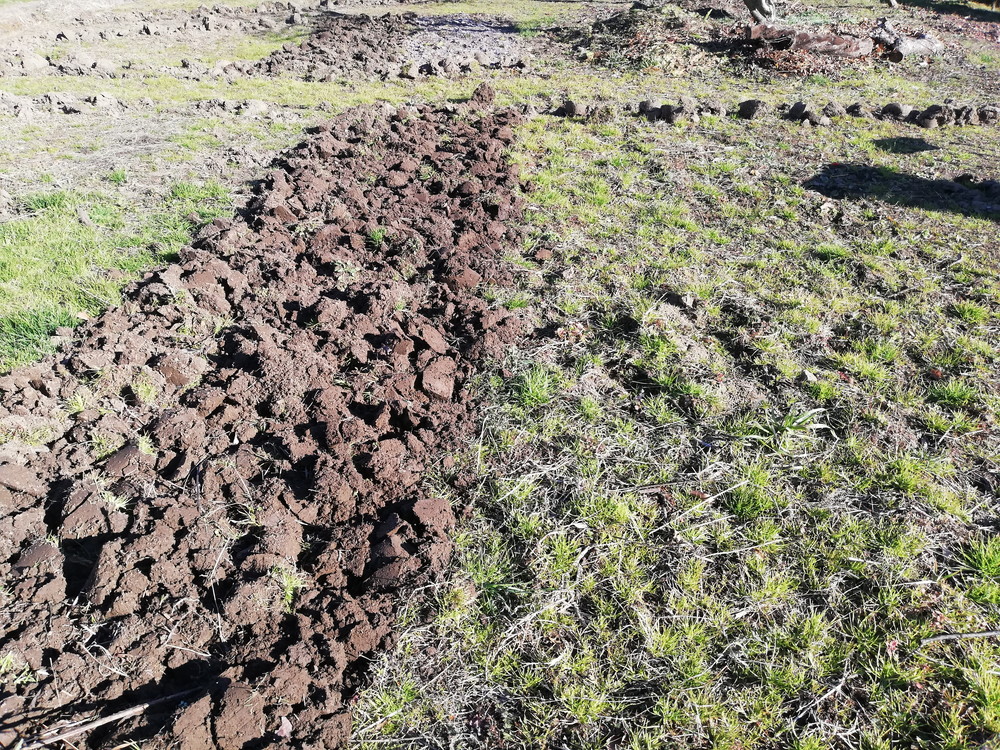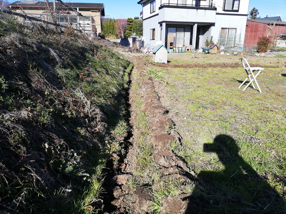 天地返しの前に、豪雨で畑が水浸しになったら困るので、お隣さんとの境界に水路を掘りました。もともと水路は掘ってあったのですが、平らになってきていたので掘り足した形です。