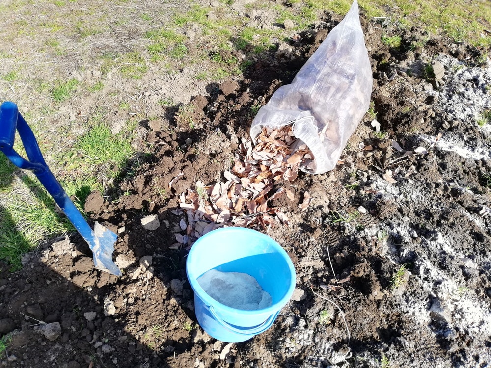 畑に戻って落ち葉をまき、あらかじめコイン精米所から取ってきた米ぬかに苦土石灰を適量混ぜたものを落ち葉にまぶします。