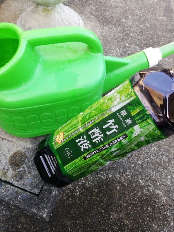 土を被せたら上から更に米ぬかをまぶします。そして、竹酢液をジョウロ1杯にキャップ1杯。土壌改良が謳われていたのでまいてみました。原理や効果は不明。酢酸が含まれており強烈な臭いがするので、動物・虫よけの効果の方はありそうです。水をかけることで米ぬかが固まり多少なりとも落ち葉を保持してくれます。