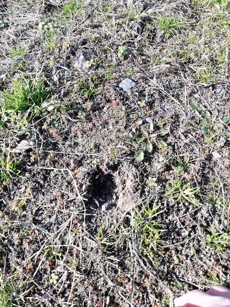 イノシシの足跡を見つけてしまいました。数日前にまいた米ぬかの臭いに誘われてきたのだろうか。