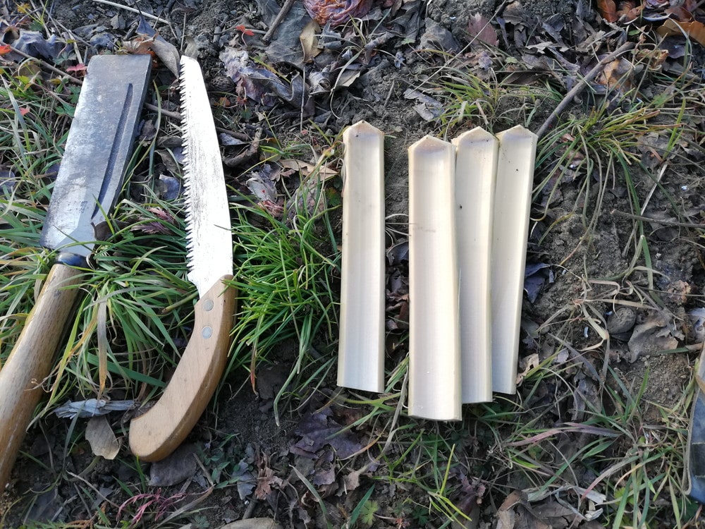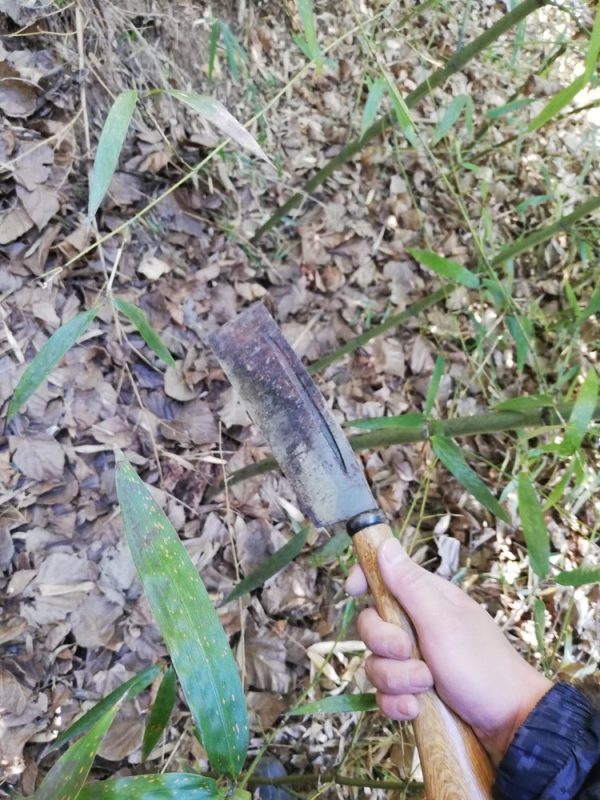 裏山の竹やぶから支柱用に竹を取ってきました。細めの竹であればノコで切るより鉈で一刀両断したほうが早いですね。