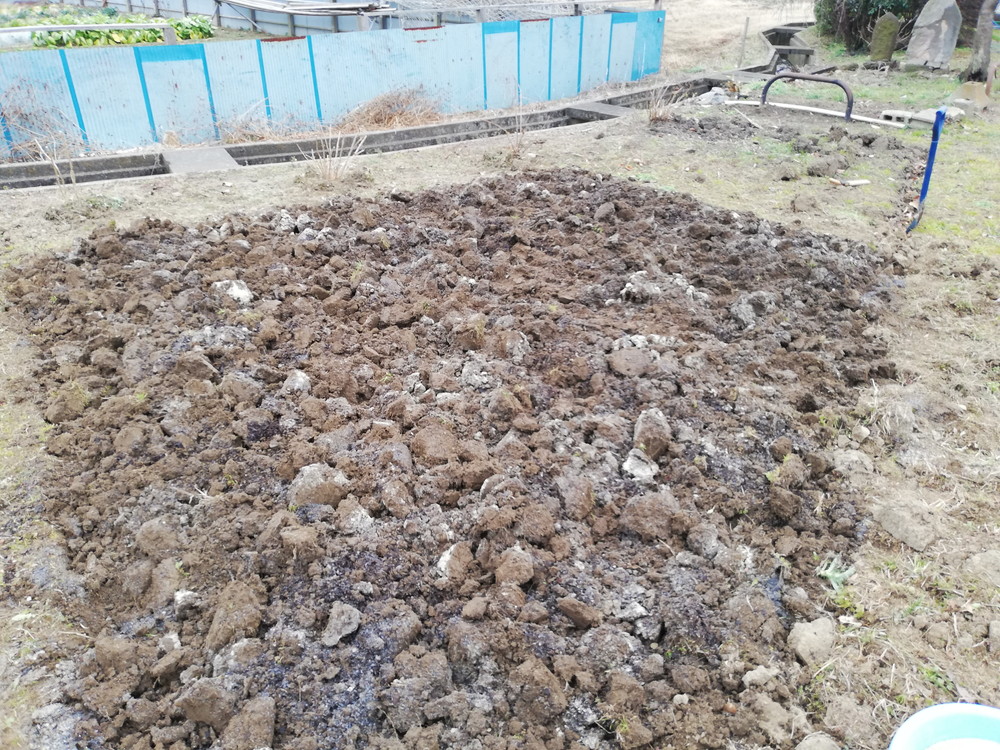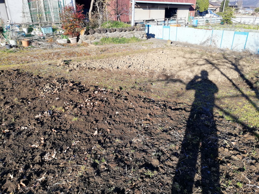 まだ塊がありますが、そのうち風化して解けるので、3月に畝を作るときにスコップで叩いてつぶせばいいでしょう。