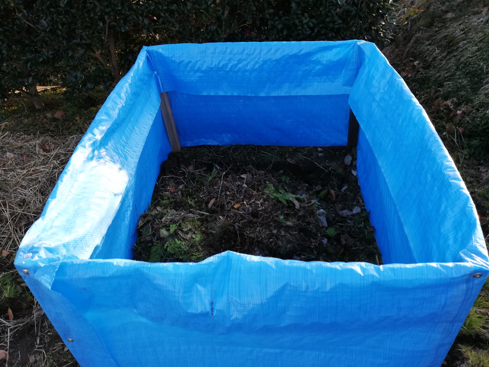 畑の片隅に落ち葉堆肥を作る場所を設けました。適当な大きさの杉の杭を4本買い(560円)、手持ちのビニールシートを巻き付けてトタン用の傘付きの釘で固定しました。