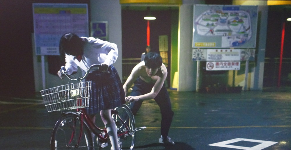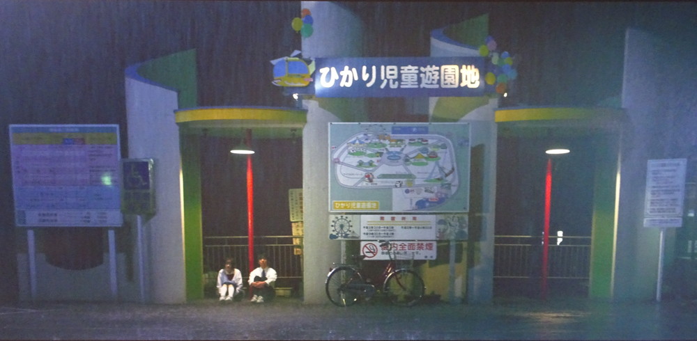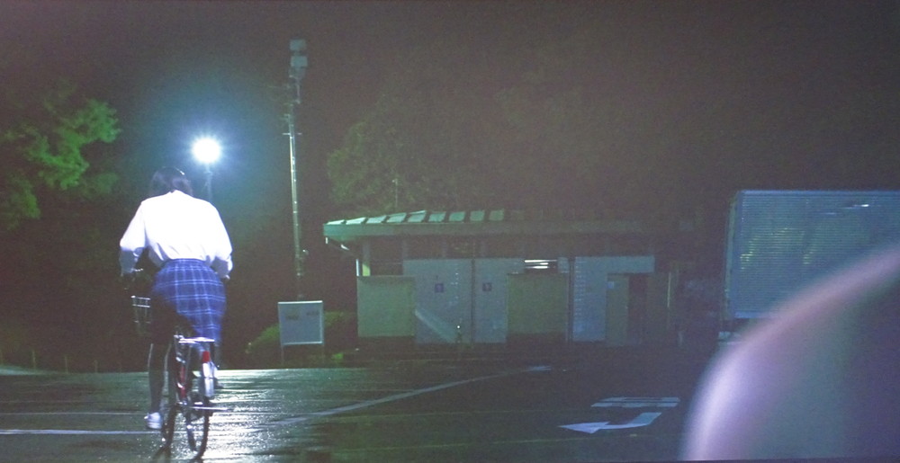 春日が夜の遊園地前で佐伯さんと中村さんに失望されるシーン