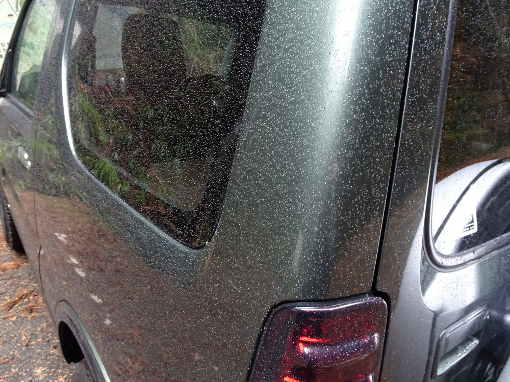 コーティング前はべちゃーっと雨水がボディにへばりついていたのに、コーティング後はこんなに弾きます。
