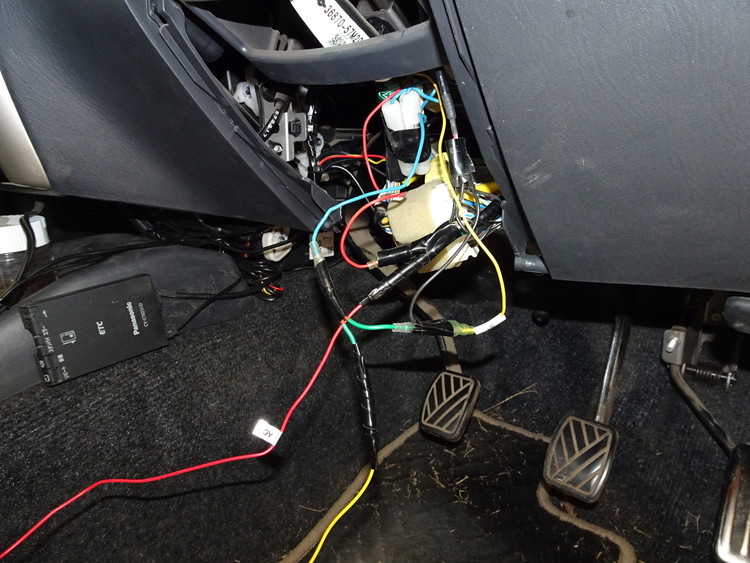 画像は少々汚いですがこうなりました。画像には仮止めで落ち着いているブースト計の配線もあります。ETCとブースト計とドラレコがヒューズボックスから取り出した電源にたこ足でつながっています。アンペア的には余裕はありますが真似はしないほうがいいと思います。